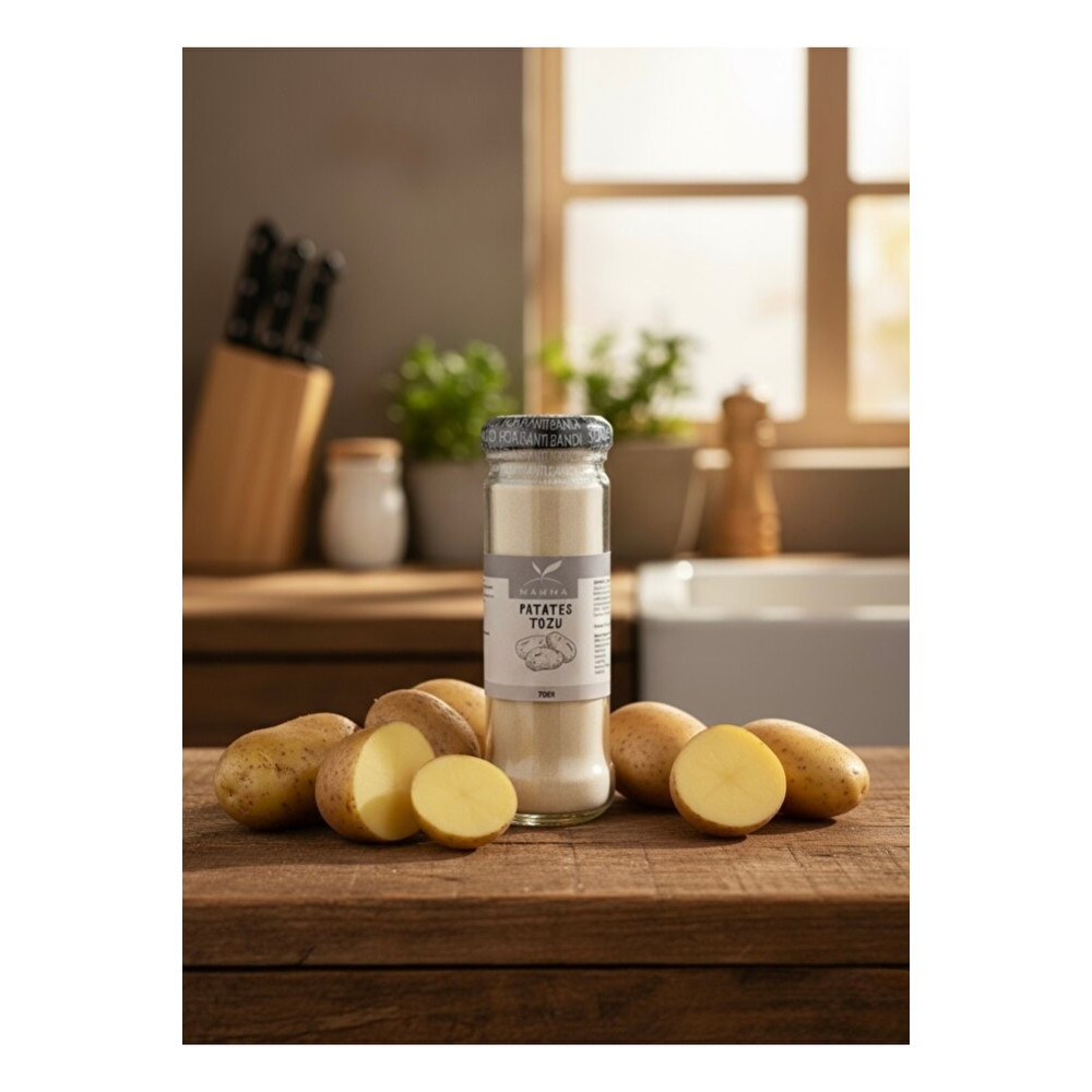 İçindekiler: Patates tozu. ; Katkı ve koruyucu içermez. ; Taze ve doğal sebzelerin kurutulması ile elde edilir. ; Yaklaşık olarak 10 kg taze sebzenin kurutulmasıyla 1kg toz elde edilmektedir. ; Bu sayede besin değerleri taze sebzeye göre çok yüksektir. ; Gramajı:60gr Ürünlerimiz Tarım Bakanlığının izni ve denetiminde, ilgili mevzuat hükümlerine uygun olarak üretilmektedir. ; İşletme Kayıt No: TR-54- K-019901;