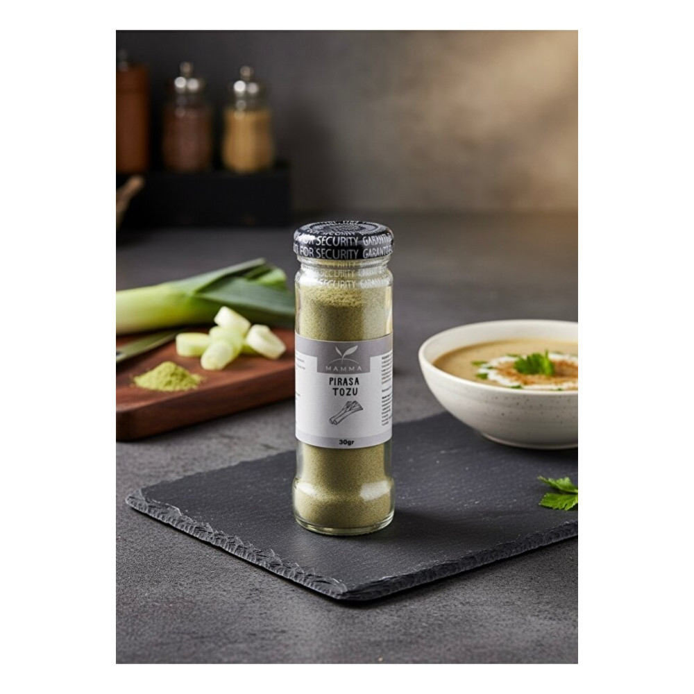 İçindekiler: Pırasa tozu. ; Katkı ve koruyucu içermez. ; Taze ve doğal sebzelerin kurutulması ile elde edilir. ; Yaklaşık olarak 10 kg taze sebzenin kurutulmasıyla 1kg toz elde edilmektedir. ; Bu sayede besin değerleri taze sebzeye göre çok yüksektir. ; Gramajı:60gr Ürünlerimiz Tarım Bakanlığının izni ve denetiminde, ilgili mevzuat hükümlerine uygun olarak üretilmektedir. ; İşletme Kayıt No: TR-54- K-019901;