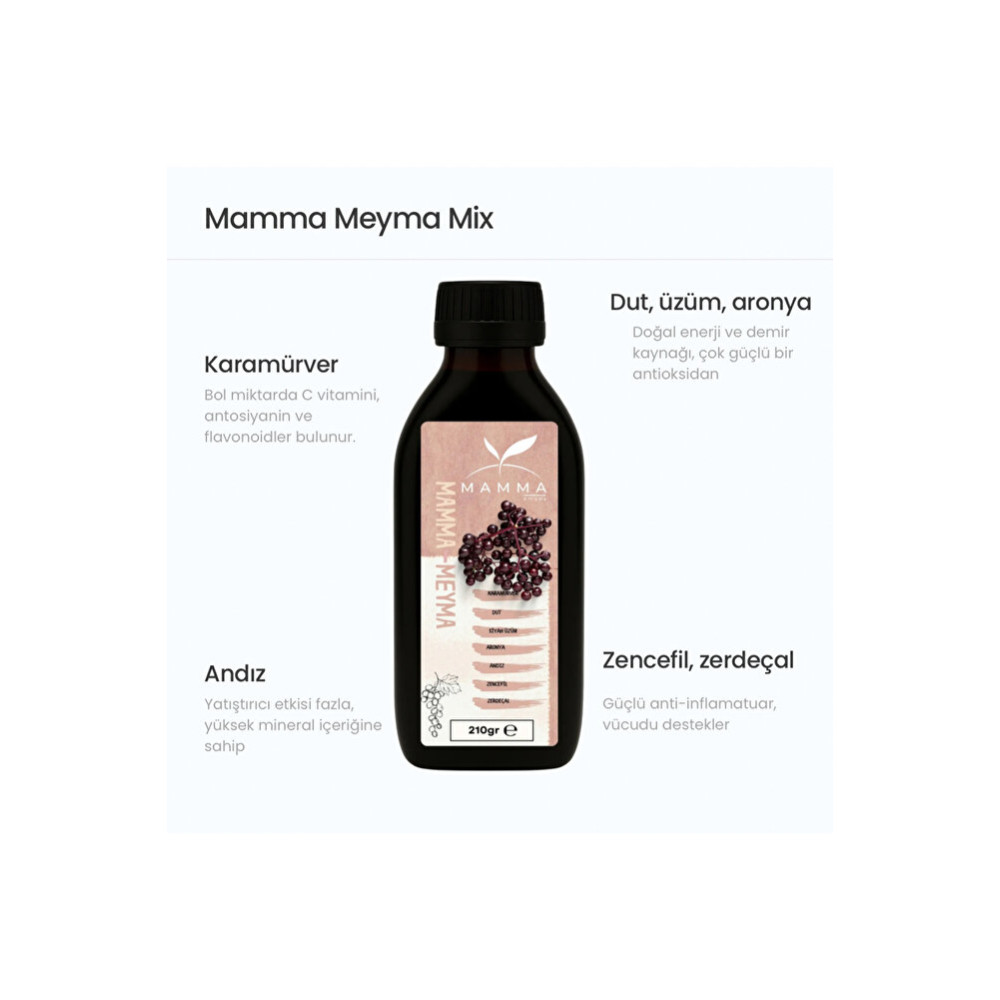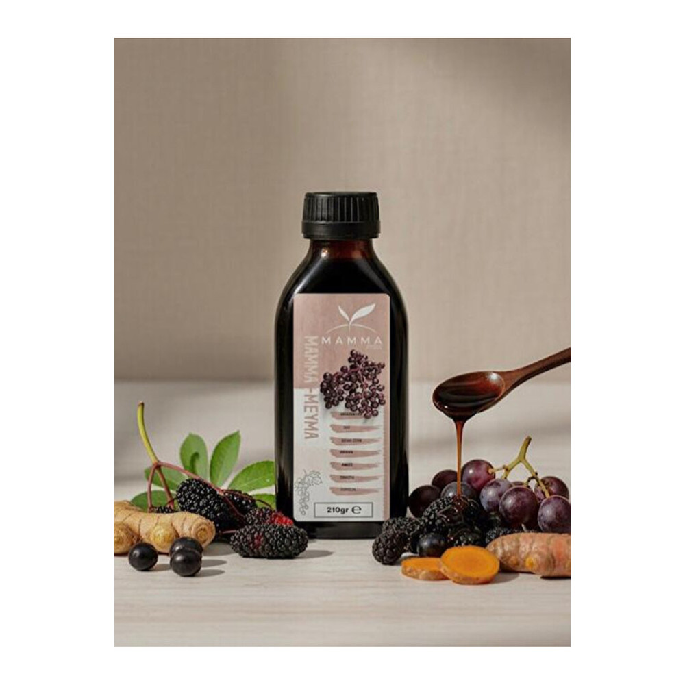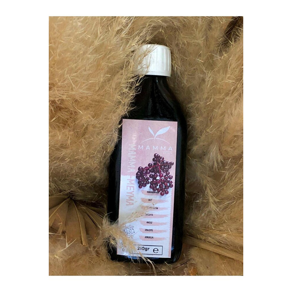 İçindekiler: Karamürver, dut özü, siyah üzüm özü, aronya özü, andız pekmezi, zencefil ve zerdeçal Alerjen notu: zencefil ve zerdeçal içerir.; Ürün içindeki herhangi bir bileşene alerjiniz varsa lütfen kullanmayın.; 100 gr için ortalama besin değerleri Enerji (kcal/kj): 122/510 Karbonhidrat: 28.4g Şeker: 17.93g Protein: 1.77g Yağ: 0.37g Doymuş yağ: 0.1g Tuz: 0.1g Meyve özleri ve zencefil, zerdeçal karışımı hazırlayarak ürettiğimiz Meyma lezzetli tadıyla sizlerin de beğenisini kazanacak.; Katkı ve koruyucu içermediğinden açıldıktan sonra buzdolabında muhafaza edilmesi tavsiye edilir.; Ürün sıcakta bekletilmemelidir.; Üründe köpüklenme görülebilir.; Bozulma değildir, dolum sırasında oluşmaktadır.; Kullanmadan önce çalkalayınız.