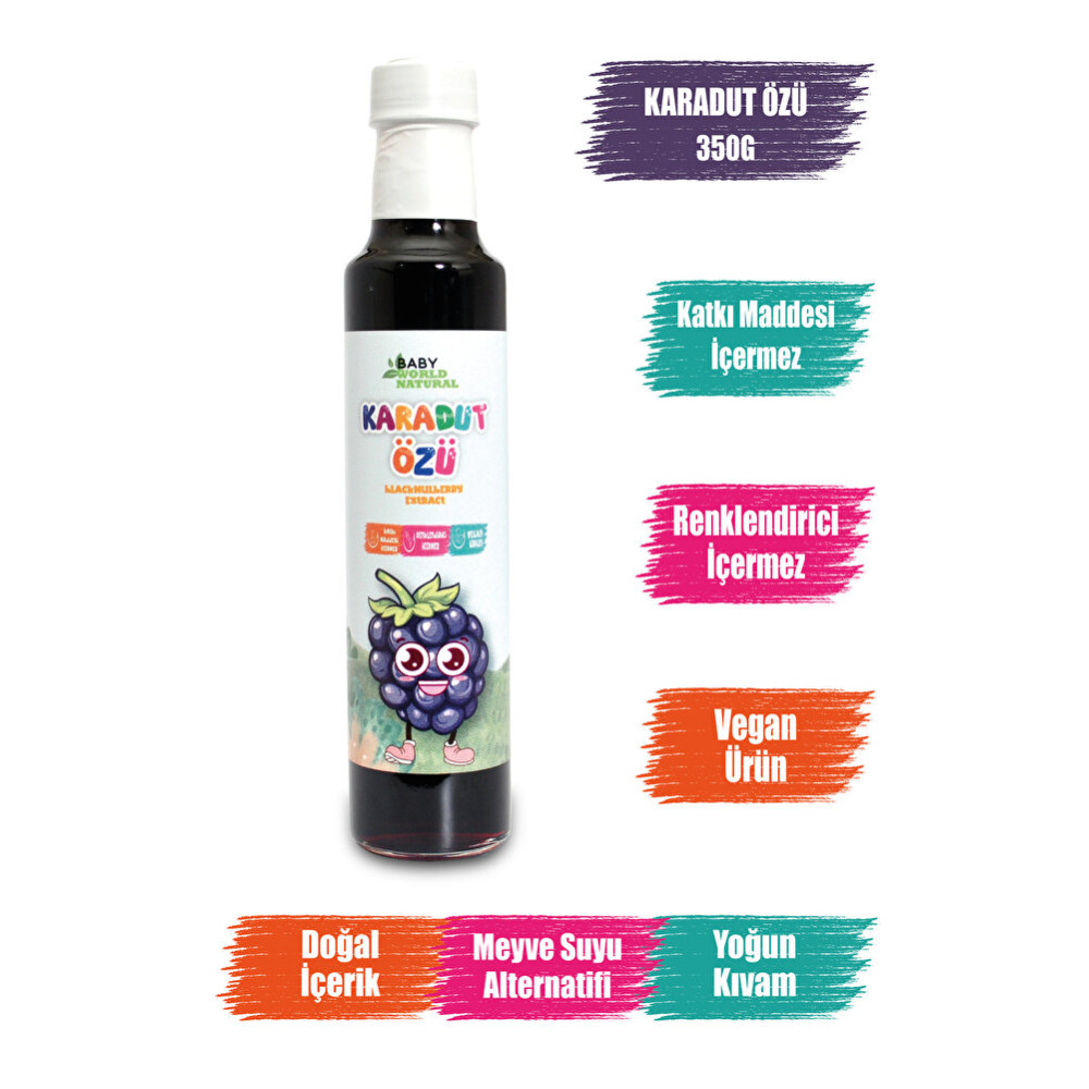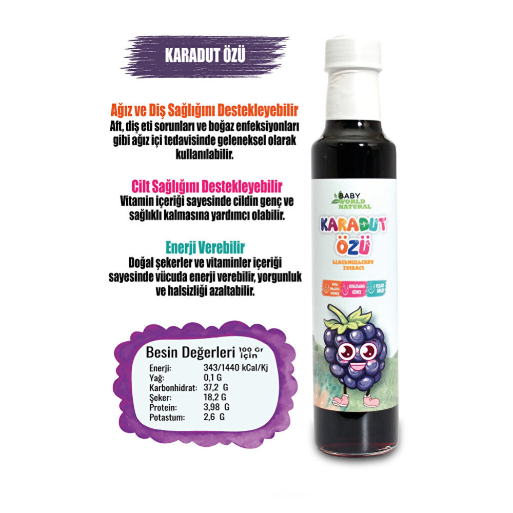 Baby World Natural Karadut Özü, içeriğinde doğal olarak bulunan vitaminlerle de dikkat çeker. Karadut, C vitamini, K vitamini, A vitamini, folat, potasyum ve manganez gibi besin öğeleri açısından zengindir. Baby World Natural Karadut Özü, çeşitli tatlı ve içeceklerinizde kullanabileceğiniz özel bir ürünüdür. İçeriğindeki yüksek kaliteli karadutlarla zenginleştirilmiş olan bu öz, kek, pasta ve tatlılarınıza eşsiz bir tat ve aroma katmak için idealdir. Ürünümüzü 1/4 oranında sulandırarak tüketebilirsiniz, bu da kullanımınızı esnek hale getirir ve lezzet dengesini kolayca ayarlamanıza imkan tanır. Kek ve pastalarınıza sürerek veya içeriklerine ekleyerek özgün tatlar yaratabilirsiniz. Ayrıca sos olarak da kullanılabilir, tatlılarınıza ve keklerinize ekstra lezzet ve görsellik katabilirsiniz. Baby World Natural Karadut Özü, içecek ve kokteyllerde de kullanıma uygundur. İçeceklerinize ve karışımlarınıza doğal bir tat ve renk katarken, kokteyllerinize de benzersiz bir lezzet ve ferahlık sağlar. Doğal içeriğiyle bilinen ve pratik kullanımıyla tercih edilen Baby World Natural Karadut Özü, mutfağınıza farklı bir boyut kazandıracak.