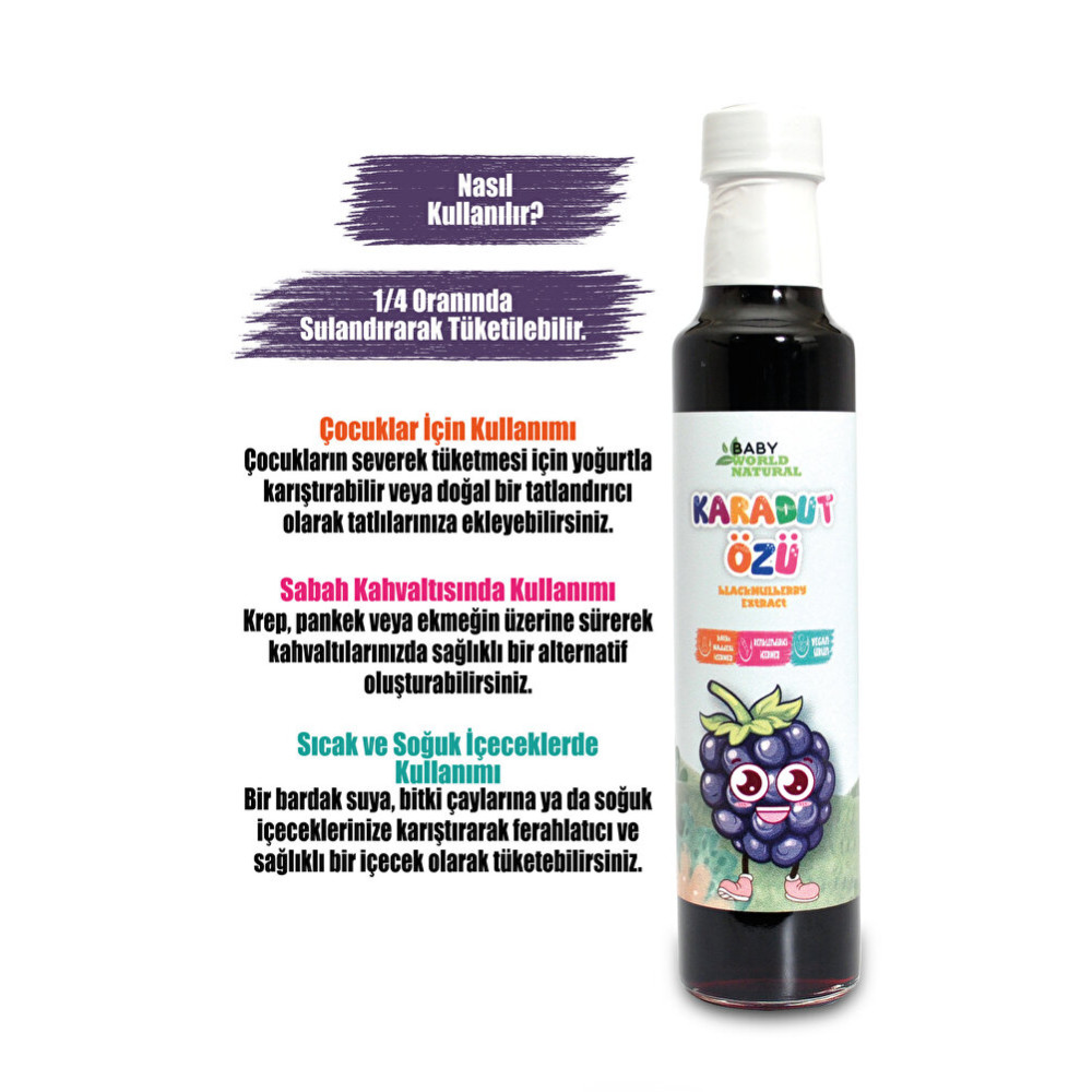 Baby World Natural Karadut Özü Miktarı: Yetişkinler İçin: Genel Dozaj: Günde 1-2 yemek kaşığı (15-30 ml) Su veya İçecekle Karıştırma: Karadut özünü bir bardak su, meyve suyu veya bitki çayı ile karıştırarak içebilirsiniz. Çocuklar İçin: Genel Dozaj: Günde 1-2 tatlı kaşığı (5-10 ml) Su, ek gıdalar veya İçecekle Karıştırma: Karadut özünü bir bardak su veya meyve suyu ile karıştırarak çocuklara verebilirsiniz. Özel Durumlar İçin Kullanım Miktarı: Hamile ve Emziren Kadınlar: Kullanım öncesi doktorunuza danışmanız önerilir. Genel olarak yetişkin dozajı uygulanabilir, ancak doktorunuzun önerdiği miktarı takip etmek en iyisidir. Yaşlılar: Yetişkin dozajı genellikle uygun olacaktır, ancak özel sağlık koşulları göz önünde bulundurulmalıdır. Herhangi bir sağlık sorunu varsa, doktorunuza danışmanız önemlidir. Dikkat Edilmesi Gerekenler: Alerjiler: Karadut özüne karşı alerjiniz varsa, kullanmadan önce doktorunuza danışın. Yan Etkiler: Herhangi bir yan etki hissederseniz, kullanımı durdurun ve doktorunuza başvurun. Dozaj Aşımı: Tavsiye edilen dozajları aşmamaya özen gösterin. Aşırı tüketim mide rahatsızlıklarına veya diğer sağlık sorunlarına yol açabilir. Önerilen Kullanım Yöntemleri: İçecekler: Karadut özünü su, soda, bitki çayları veya smoothieler ile karıştırarak tüketebilirsiniz. Gıdalar: Yoğurt, mısır gevreği, salatalar veya tatlılar üzerine ekleyerek kullanabilirsiniz. Bu kılavuzu takip ederek karadut özünü güvenli ve etkili bir şekilde kullanabilirsiniz. Yine de, özel bir sağlık durumunuz veya sorunuz varsa, bir sağlık profesyoneline danışmanız en iyisidir.