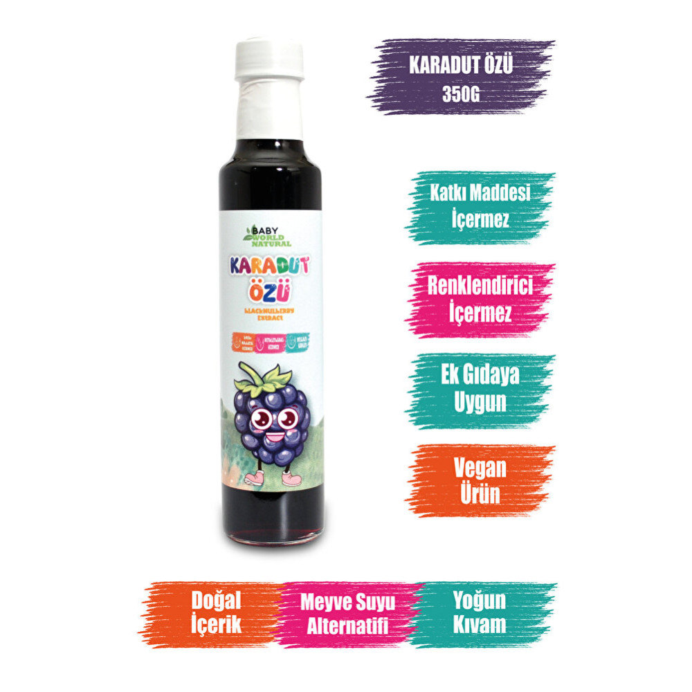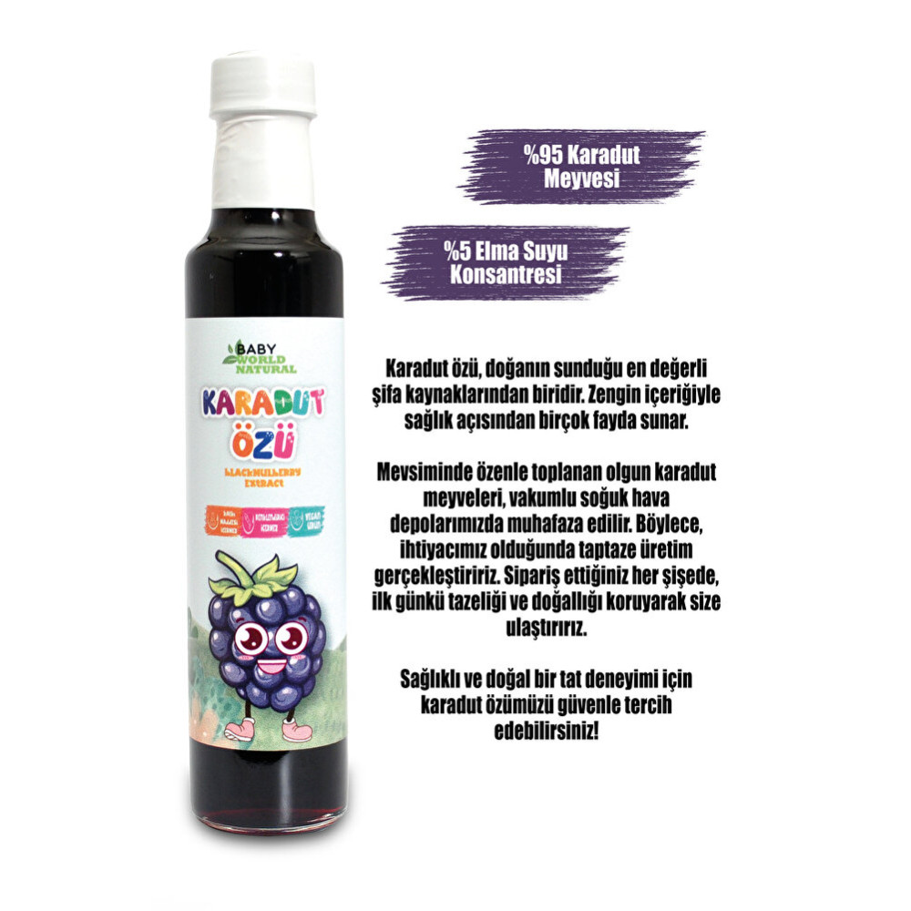 Baby World Natural Karadut Özü, içeriğinde doğal olarak bulunan vitaminlerle de dikkat çeker. Karadut, C vitamini, K vitamini, A vitamini, folat, potasyum ve manganez gibi besin öğeleri açısından zengindir. Baby World Natural Karadut Özü, çeşitli tatlı ve içeceklerinizde kullanabileceğiniz özel bir ürünüdür. İçeriğindeki yüksek kaliteli karadutlarla zenginleştirilmiş olan bu öz, kek, pasta ve tatlılarınıza eşsiz bir tat ve aroma katmak için idealdir. Ürünümüzü 1/4 oranında sulandırarak tüketebilirsiniz, bu da kullanımınızı esnek hale getirir ve lezzet dengesini kolayca ayarlamanıza imkan tanır. Kek ve pastalarınıza sürerek veya içeriklerine ekleyerek özgün tatlar yaratabilirsiniz. Ayrıca sos olarak da kullanılabilir, tatlılarınıza ve keklerinize ekstra lezzet ve görsellik katabilirsiniz. Baby World Natural Karadut Özü, içecek ve kokteyllerde de kullanıma uygundur. İçeceklerinize ve karışımlarınıza doğal bir tat ve renk katarken, kokteyllerinize de benzersiz bir lezzet ve ferahlık sağlar. Doğal içeriğiyle bilinen ve pratik kullanımıyla tercih edilen Baby World Natural Karadut Özü, mutfağınıza farklı bir boyut kazandıracak.