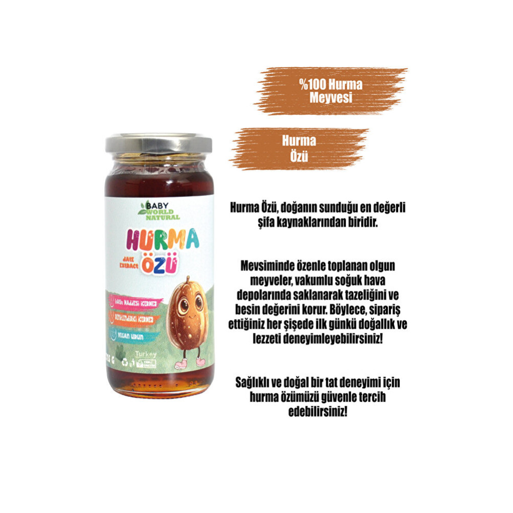 Baby World Natural Hurma Özü, doğadan gelen bir armağan ve doğal tatların keyfini çıkarmak isteyenler için ideal bir seçenektir. Bu eşsiz ürün, kaliteli yaşam tarzınızı sürdürmenize yardımcı olacak besleyici özellikleriyle öne çıkar. Baby World Natural Hurma Özü, içeriğinde bulunan doğal vitaminler ve mineraller sayesinde vücudunuzun ihtiyaç duyduğu destekleyici besinleri sağlar. Yüksek lif içeriğiyle sizleri desteklerken, doğal tat profiliyle de tatlı ihtiyacınızı doğal bir şekilde karşılamanıza yardımcı olur. Her bir damlası doğanın en taze ve saf lezzetlerini barındırırken, Baby World Natural Hurma Özü, atıştırmalıklarınızı, tatlı krizlerinizi veya enfes tariflerinizi zenginleştirmek için mükemmel bir seçenektir. Doğal tatların keyfini çıkarırken günlük tatlı ihtiyacınızı da desteklemek istiyorsanız, Baby World Natural Hurma Özü'nü tercih edebilirsiniz. Kaliteli yaşam tarzınıza bir dokunuş katmak ve doğanın bu eşsiz lezzetini keşfetmek için Baby World Natural Hurma Özü'nü deneyin. Doğadan gelen lezzetin tadını çıkarın!