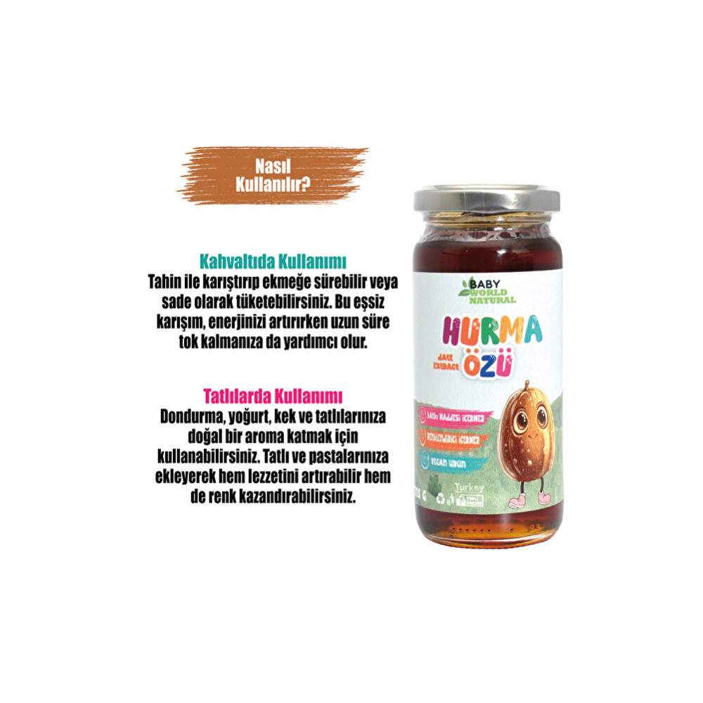 Baby World Natural Hurma Özü Miktarı: Yetişkinler İçin: Genel Dozaj: Günde 1-2 yemek kaşığı (15-30 ml) Su veya İçeceklerle Karıştırma: Hurma özünü bir bardak su, meyve suyu veya bitki çayı ile karıştırarak içebilirsiniz. Çocuklar İçin: Genel Dozaj: Günde 1-2 tatlı kaşığı (5-10 ml) Su, ek gıdalar veya İçecekle Karıştırma: Hurma özünü bir bardak su veya meyve suyu ile karıştırarak çocuklara verebilirsiniz. Özel Durumlar İçin Kullanım Miktarı: Hamile ve Emziren Kadınlar: Kullanım öncesi doktorunuza danışmanız önerilir. Genel olarak yetişkin dozajı uygulanabilir, ancak doktorunuzun önerdiği miktarı takip etmek en iyisidir. Yaşlılar: Yetişkin dozajı genellikle uygun olacaktır, ancak özel sağlık koşulları göz önünde bulundurulmalıdır. Herhangi bir sağlık sorunu varsa, doktorunuza danışmanız önemlidir. Dikkat Edilmesi Gerekenler: Alerjiler: Hurma özüne karşı alerjiniz varsa, kullanmadan önce doktorunuza danışın. Yan Etkiler: Herhangi bir yan etki hissederseniz, kullanımı durdurun ve doktorunuza başvurun. Dozaj Aşımı: Tavsiye edilen dozajları aşmamaya özen gösterin. Aşırı tüketim mide rahatsızlıklarına veya diğer sağlık sorunlarına yol açabilir. Önerilen Kullanım Yöntemleri: İçecekler: Hurma özünü su, soda, bitki çayları veya smoothieler ile karıştırarak tüketebilirsiniz. Gıdalar: Yoğurt, mısır gevreği, salatalar veya tatlılar üzerine ekleyerek kullanabilirsiniz. Bu kılavuzu takip ederek hurma özünü güvenli ve etkili bir şekilde kullanabilirsiniz. Yine de, özel bir sağlık durumunuz veya sorunuz varsa, bir sağlık profesyoneline danışmanız en iyisidir.