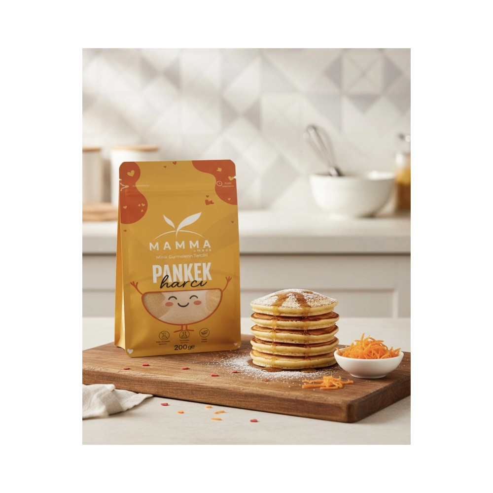 İçindekiler: Siyez unu, yulaf unu, buğday unu, ruşeym, havuç tozu, kabartma tozu Tarif: 5 yemek kaşığı silme harca ( 50 gram) 1 yumurta kırıyoruz.; Üzerine 50 - 60 ml su ilave ediyoruz.; Akışkan, kıvamlı olana kadar çırpıyoruz.; Isıtılan ve yağlanan tavada kısık ateşte alt - üst kızarana kadar pişiriyoruz.; Bebeğinizin yumurta alerjisi varsa yumurta yerine muz, meyve püresi kullanabilirsiniz.; Pankek harcımız şeker içermemektedir.; ; Pişirmeden önce elma suyu kullanarak ya da pişirdikten sonra pekmez, hurma özü gibi ürünler kullanarak tatlandırabilirsiniz.; 1 porsiyondan 6 - 7 adet pankek yapabilirsiniz.; 200 gram 4 porsiyon Alerjen notu: Gluten içerir.; 100 gr için ortalama besin değerleri Enerji (kcal/kj): 346/1447 Karbonhidrat: 64.39g Yağ:2.95g Doymuş yağ:0.60g Protein: 11.72g Şeker: 2.7g Tuz:0.97g B1 vitamini: 0.35mg Serin ve kuru bir yerde ağzı kapalı şekilde muhafaza ediniz.; Ürün içindeki herhangi bir bileşene alerjiniz varsa lütfen kullanmayın.; Ürünlerimiz Tarım Bakanlığının izni ve denetiminde, ilgili mevzuat hükümlerine uygun olarak üretilmektedir.; İşletme Kayıt No: TR-54- K-019901
