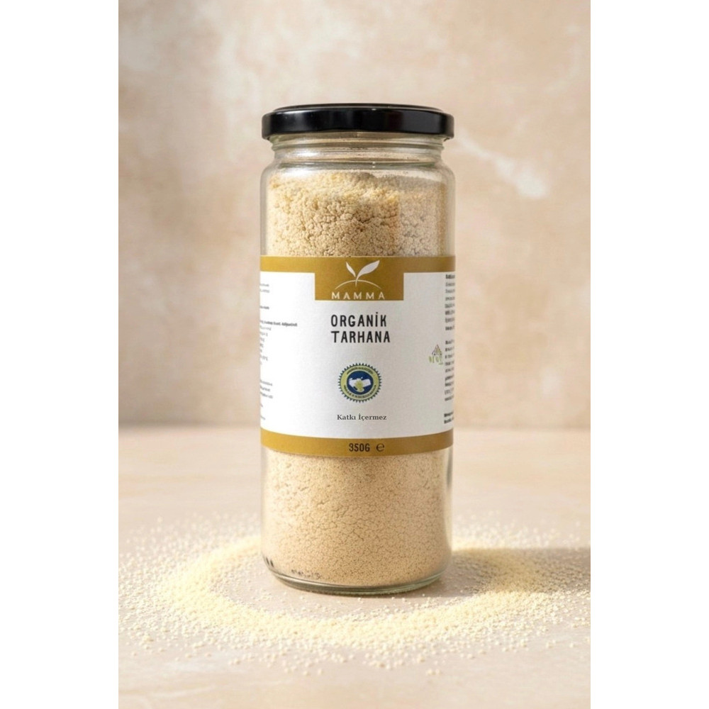 İçindekiler: Organik tam buğday unu,organik kapya biber,organik kuru soğan,organik ekşi maya,organik havuç,organik süzme yoğurt,organik kuru nane.; Alerjen notu: Gluten (buğday) ve süt ürünü (yoğurt) içerir.; Gramaj: 350g e 100 gr için ortalama besin değerleri Enerji(kcal/kj):340/1441 Karbonhidrat:66.6g Protein:10.65g Şeker:2.67g Yağ:2.4g Doymuş Yağ:0.55g Tuz:2.7g Katkı ve koruyucu içermez.; Pişirme Önerisi: Tencerenize 1 yemek kaşığı zeytin yağı ve bir su bardağı su ekleyerek üzerine 2 yemek kaşığı tarhana ilave ediniz.; Kısık ateşte istenen kıvama gelinceye kadar karıştırılarak kaynatınız.; Ürün içindeki herhangi bir bileşene alerjiniz varsa lütfen kullanmayın.; Ürünlerimiz Tarım Bakanlığının izni ve denetiminde, ilgili mevzuat hükümlerine uygun olarak üretilmektedir.; İşletme Kayıt No: TR-54- K-019901