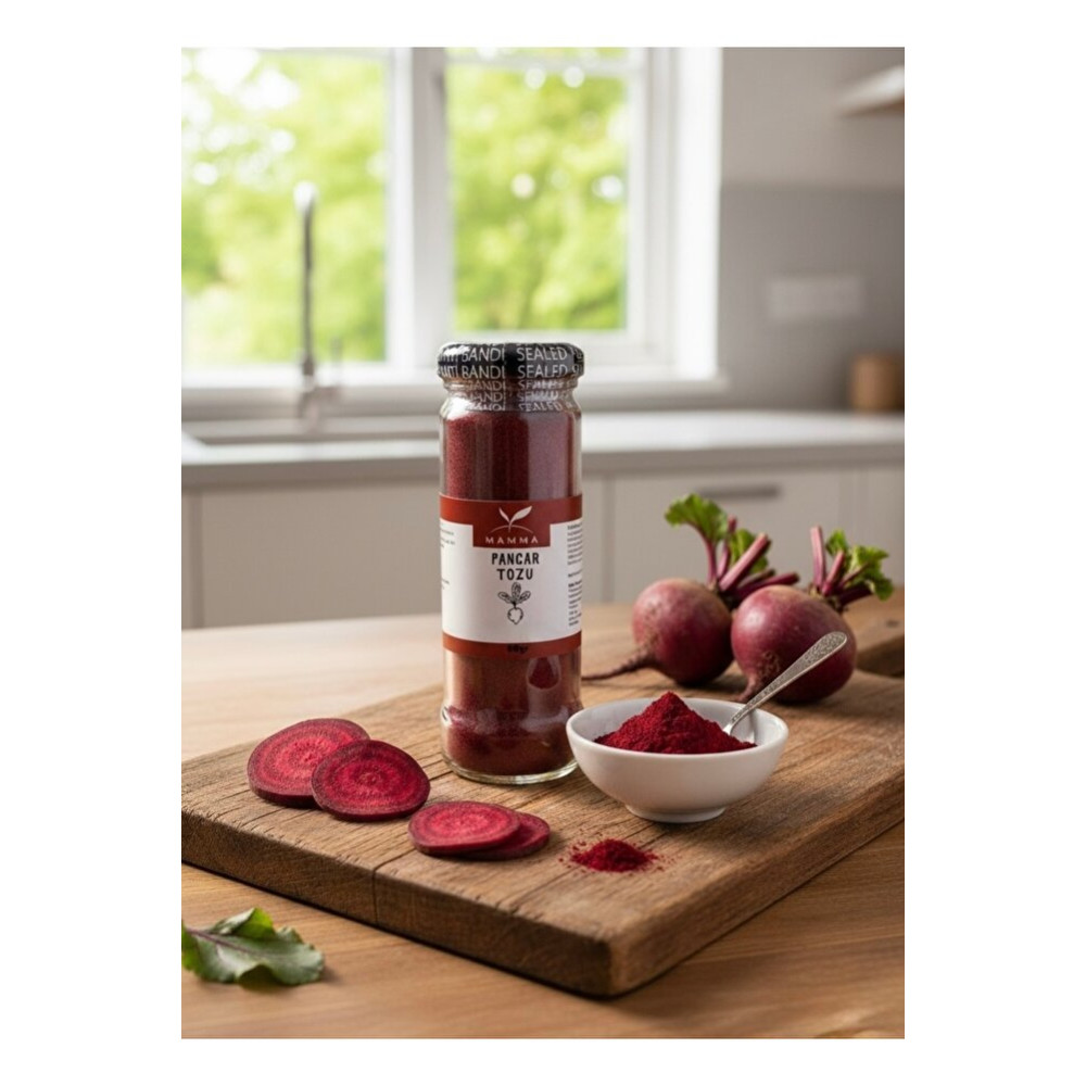 İçindekiler: Pancar tozu. ; Katkı ve koruyucu içermez. ; Taze ve doğal sebzelerin kurutulması ile elde edilir. ; Yaklaşık olarak 10 kg taze sebzenin kurutulmasıyla 1kg toz elde edilmektedir. ; Bu sayede besin değerleri taze sebzeye göre çok yüksektir. ; Gramajı:50gr Ürünlerimiz Tarım Bakanlığının izni ve denetiminde, ilgili mevzuat hükümlerine uygun olarak üretilmektedir. ; İşletme Kayıt No: TR-54- K-019901;